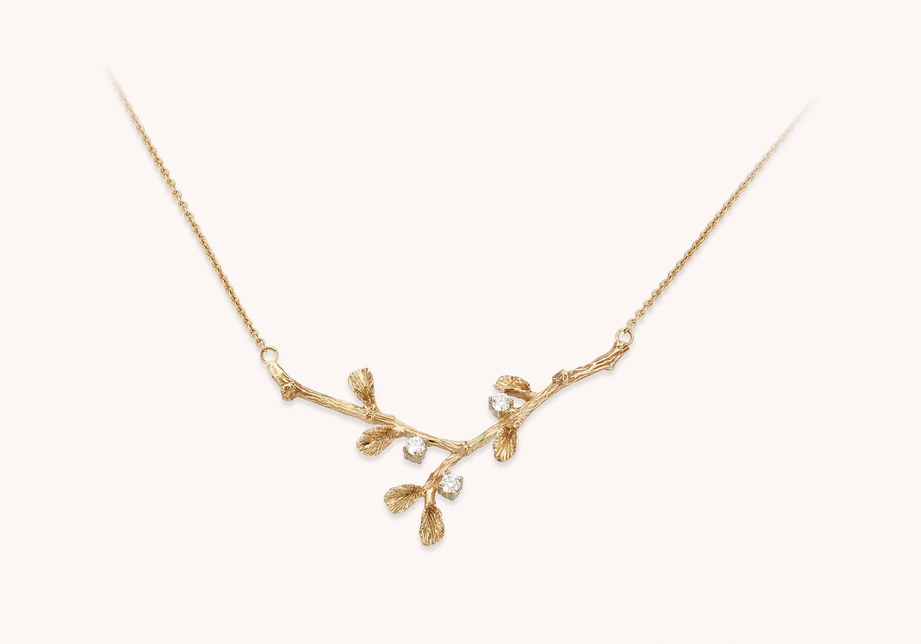 halsketting in witgoud (champagnekleur, warm witgoud) met takjes en blaadjes motief en diamant